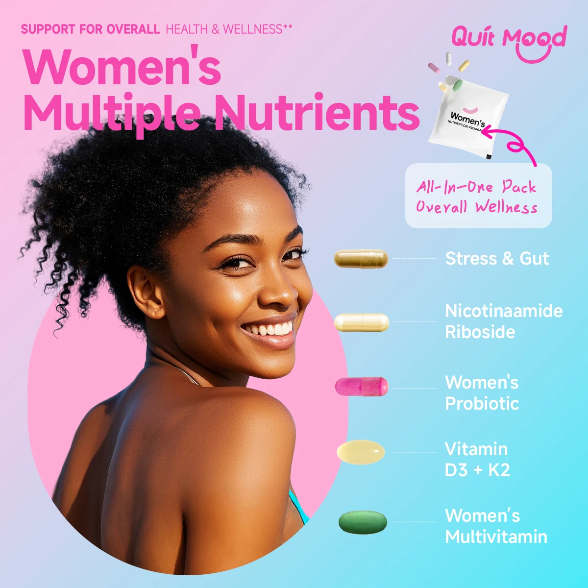 Nourish your body and mind with this all-in-one women’s multivitamin. Formulated with D3K2, NAD+, and probiotics, it supports stress relief, bone and skin health, and promotes youthful energy every day.